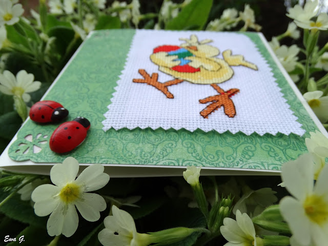 Ale wracając do kartki, sam wzór jest bardzo prosty i w dwa wieczory był gotowy. Wyszywałam na białej Aidzie 16ct, mulina DMC. Hafcik wyszedł dosyć duży, więc postanowiłam go uwydatnić ładnym i wyraźnym tłem, a jako ozdobę przykleiłam dwie biedronki.