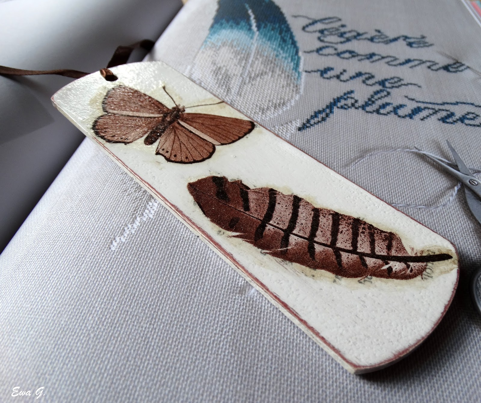 Na zakładce znalazło się obowiązkowe pióro, a towarzyszą mu dwa śliczne motyle. Poza tym zrobiłam drobne przetarcia, żeby uzyskać efekt postarzenia.