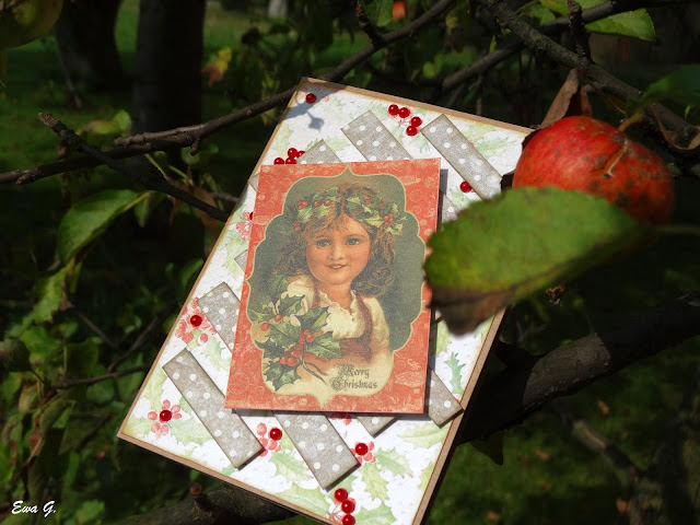 Na mojej kartce pojawił się kolor czerwony oraz beżowy. Deseń to kropki. A jako motyw wybrałam prześliczną dziewczynkę w wianku z ostrokrzewu. Ostrokrzew znajduje się także na papierze bazowym.